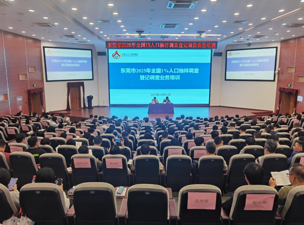 10月28日上午,东莞市2025年全国1%人口抽样调查登记调查业务培训在我校培训楼报告厅正式开班。来自全市33个镇街(园区)的230余名调查员参加培训。