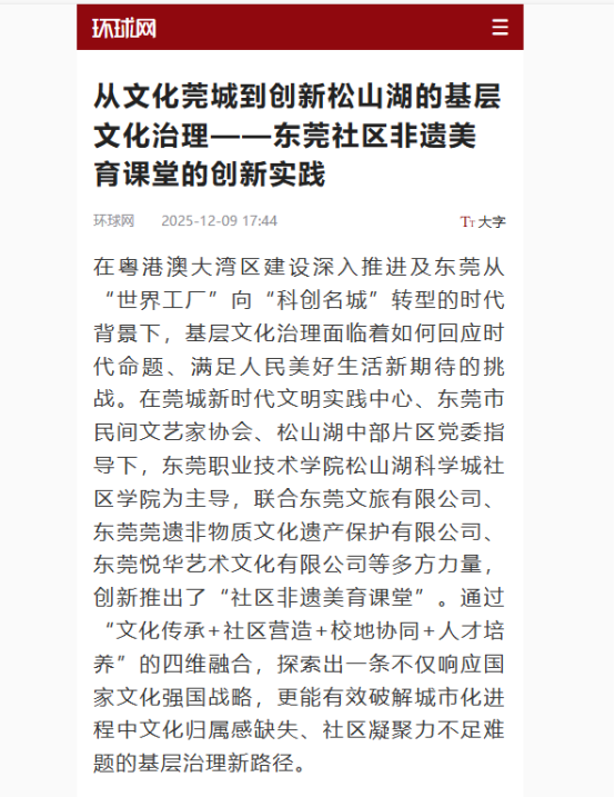 【环球网】从文化莞城到创新松山湖的基层文化治理--东莞社区非遗美育课堂的创新实践