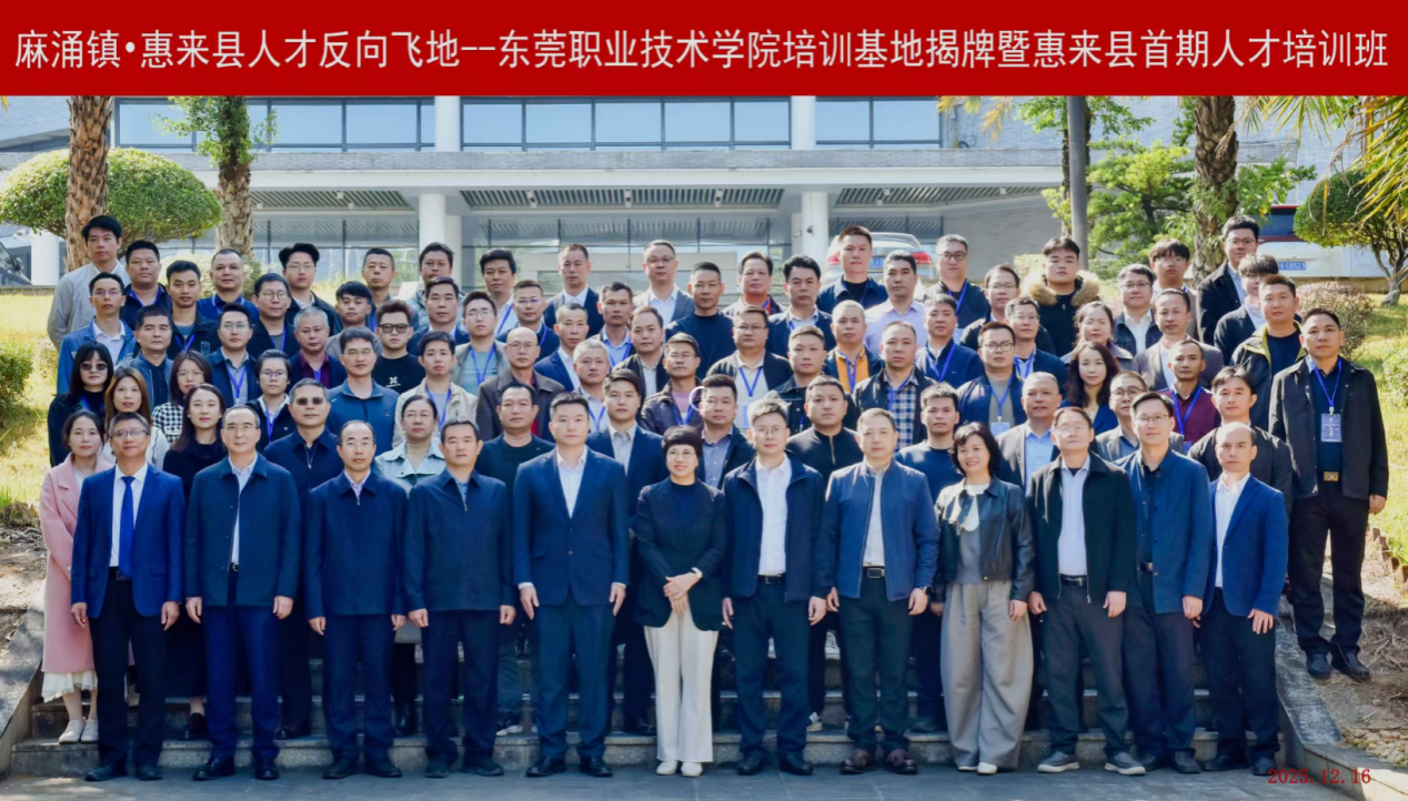 12月16日上午,“麻涌镇・惠来县人才反向飞地—东莞职业技术学院培训基地”揭牌暨惠来县2025年智能制造赋能传统产业提质升级专题培训班开班仪式,在我校立德楼B201会议室举行。该基地的落地与培训班的开班,标志着麻涌镇与惠来县在人才协作、产业赋能领域的合作迈入新阶段。