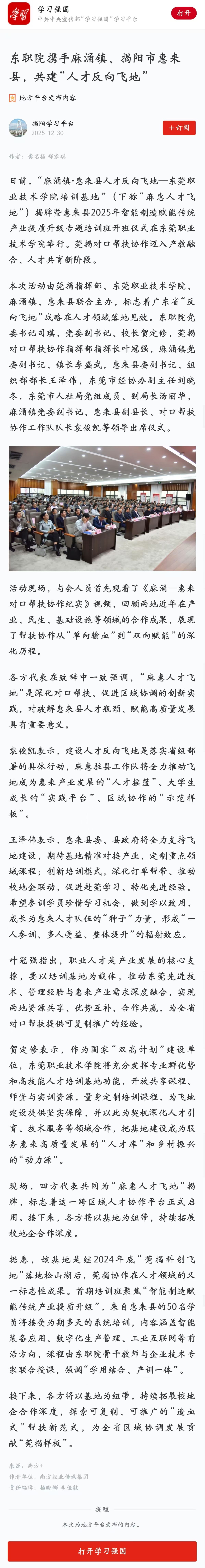 【学习强国】东职院携手麻涌镇、揭阳市惠来县,共建“人才反向飞地”